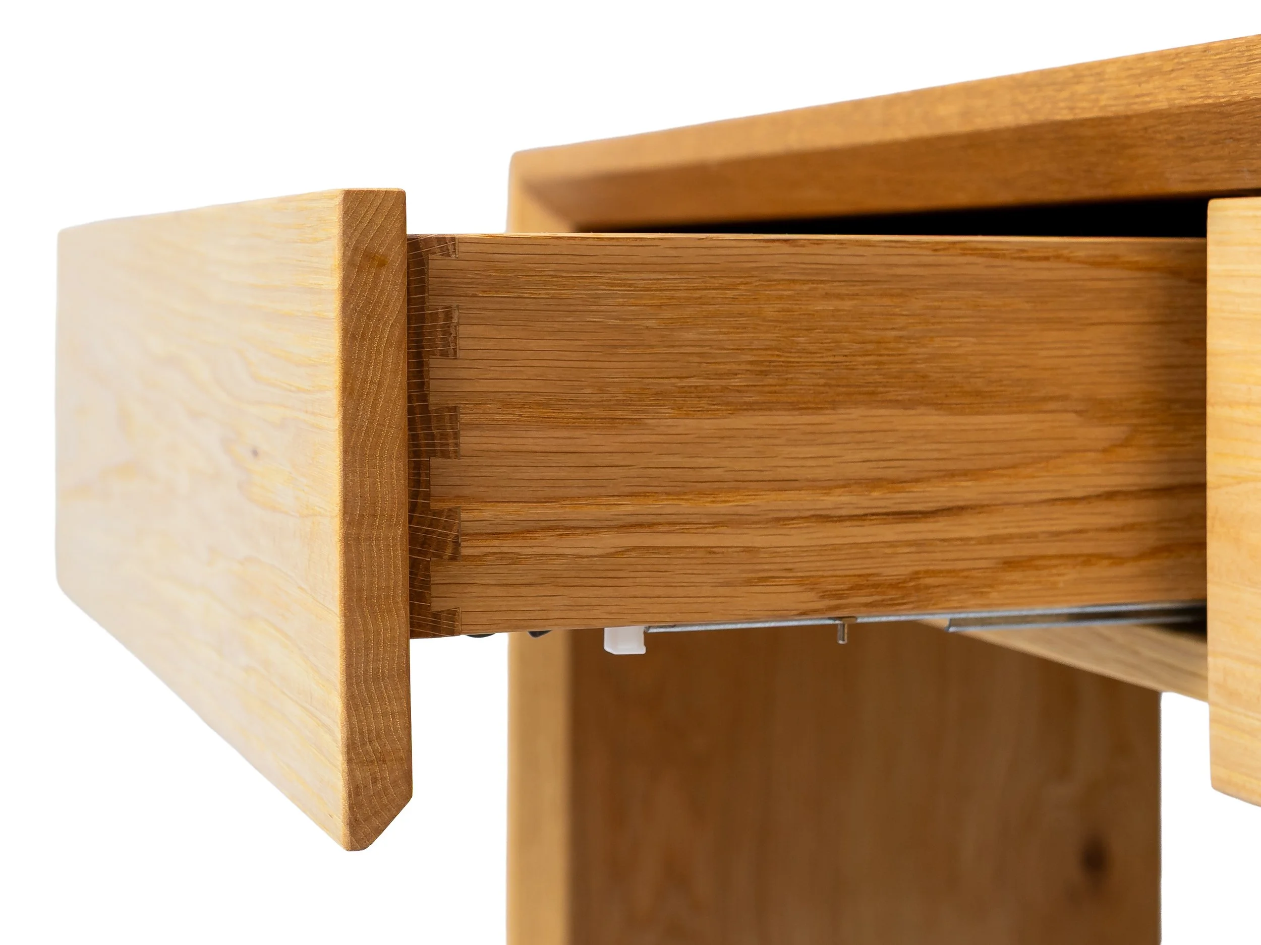 One of the standout features of this build is the pair of drawers. Crafted with traditional half-blind dovetail joinery, they add both strength and a touch of classic woodworking detail. The drawer fronts were cut from a single board so the grain runs continuously across both drawers, tying the piece together visually. To keep the design seamless, I skipped hardware and instead beveled the undersides of the drawer fronts, creating an integrated pull that feels smooth and natural to use.